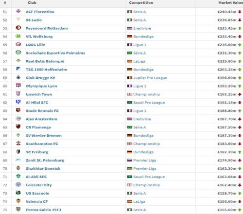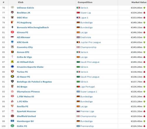 在亚洲球队里,利雅得新月排名最高,以1.92亿排名第62位,其次是吉达国民(第71位,1.63亿)、吉达联合(第87位、1.40亿)以及利雅得胜利(第90位、1.39亿)。