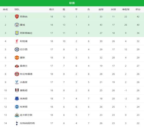 随着阿森纳21+曼城21!英超最新积分榜:利物浦险胜维尔茨首球