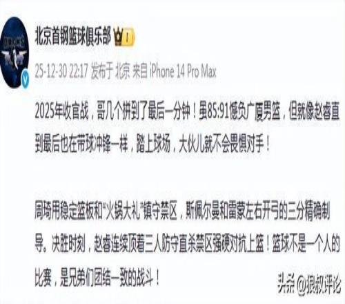 北京官方更新发文:“2025年收官战,哥几个拼到了最后一分钟!虽85:91憾负广厦男篮,但就像赵睿直到最后也在带球冲锋一样,踏上球场,大伙儿就不会畏惧对手!”