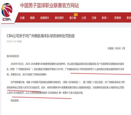 CBA公司最新公告显示,对广州队球员徐昕处罚20000元的罚款,同时,也对广州队负责人何振轩,罚款10000元。