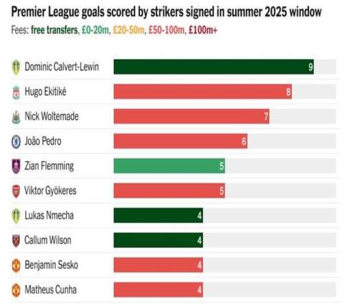 根据The Athletic的统计数据,在去年夏窗英超各队引进的中锋当中,勒温是在英超当中进球最多的,埃基蒂克排名第二,沃尔特马德第三。
