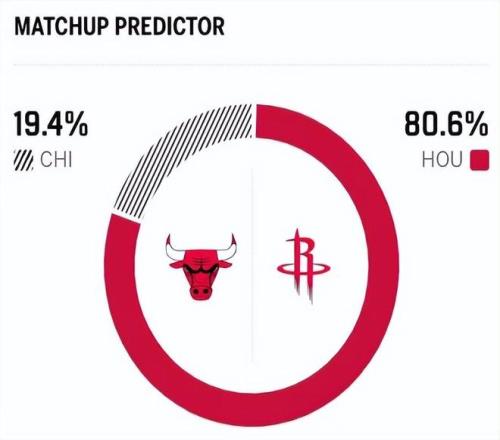 也因此,赛前,美媒ESPN对本场比赛进行了胜率预测,火箭队胜率依旧高达80.6%,占据绝对上风,公牛胜率则仅有19.4%,还是不被看好。