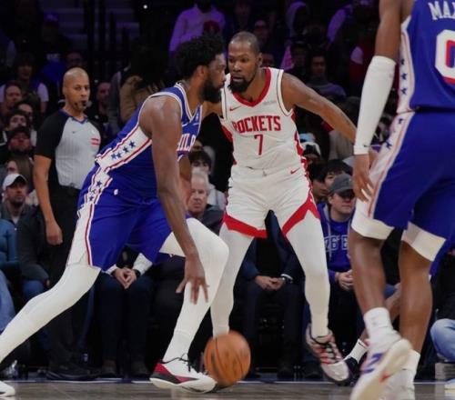 节末伊森和乌布雷对轰三分,第一节火箭34-32领先。进入第二节,恩比德继续造犯规+吃饼,杜兰特单打稳定局面,恩比德靠着阿门造三分犯规,场边乌度卡非常愤怒。双方比分交替上升,后半段阿门和申京强攻篮下,恩比德又开始造杀伤,配合马克西单打+乌布雷三分球,76人打出小高潮,半场68-61领先火箭。进入第三节,杜兰特连续飙中三分,马克西内突外投,恩比德顶翻申京,乌度卡忍无可忍冲着裁判抱怨,吃到技犯!后半段杜兰特轰三分球,申京打成1+2,小贾继续炸扣,但乌布雷和恩比德守住领先。