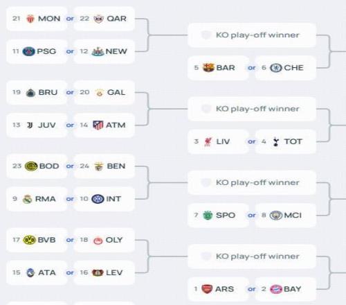 淘汰赛附加赛抽签将根据联赛阶段的排名进行分组,其中9-16名的队伍为种子队,17-24名的队伍为非种子队,种子队将在两回合比赛中先客后主。